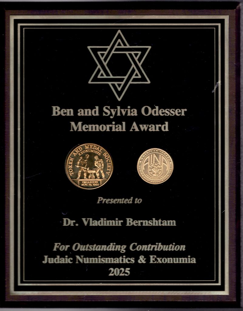 The Ben and Sylvia Odesser Award is jointly presented by the Token and Medal Society (TAMS) and the American Israel Numismatic Association (AINA). It recognizes outstanding contributions to Judaic numismatics, particularly for articles published in AINA’s journal, The Shekel. The award recognizes research and publications that examine the historical, cultural, or artistic aspects of Jewish-themed coins, medals, tokens, and related exonumia.