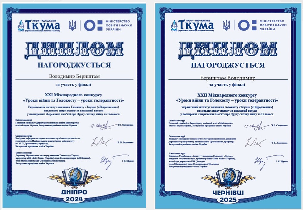 In 2024 and 2025, I participated in the “LESSONS OF WAR AND THE HOLOCAUST – LESSONS OF TOLERANCE” competition held by the Ukrainian Institute for Holocaust Studies “Tkuma.” Together with Natalia Danyliv, a historian from Lviv, I submitted works related to the use of philatelic and phaleristic materials in teaching Holocaust history. In 2025, I also submitted a work entitled “The depiction of the Holocaust in Ukraine in faleristics and numismatics.” All works advanced to the competition finals and were awarded diplomas.